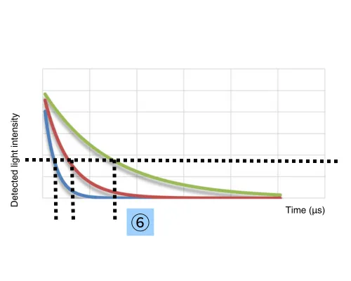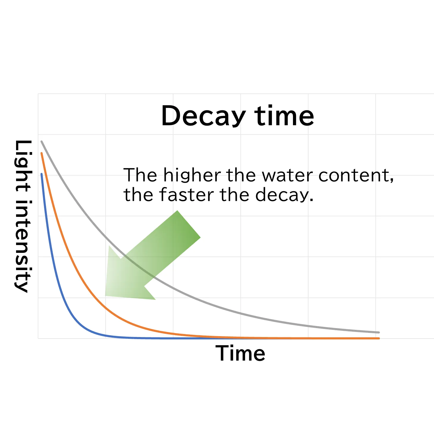 7. La teneur en humidité est calculée sur la base du temps nécessaire à l’intensité lumineuse détectée à l’étape 5 pour décroître jusqu'à un certain taux (temps de décroissance, ring down time).